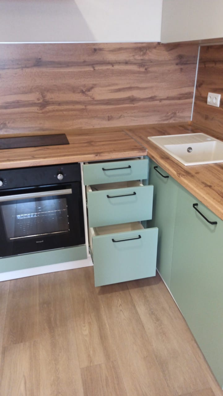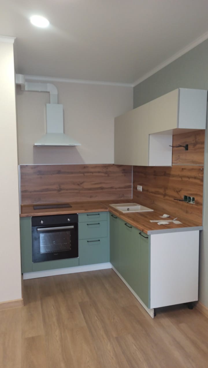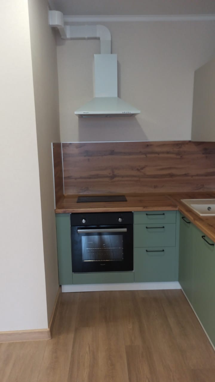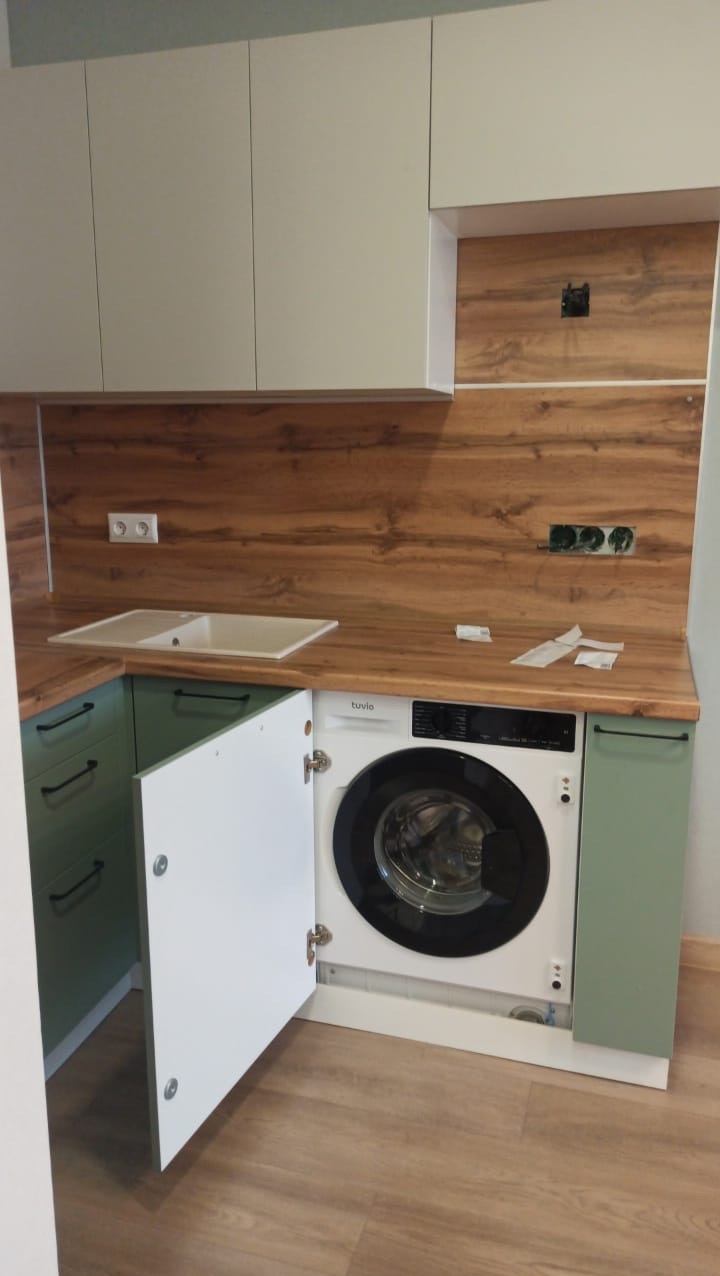 ❤️❤️❤️Небольшая уютная кухня , где предусмотрено место для встраиваемой стиральной машины , духового шкафа , вытяжки , мойки , микроволновой печи вверху над стиральной машиной ( оставили место и выведена розетка ) . Справа будет расположен холодильник.