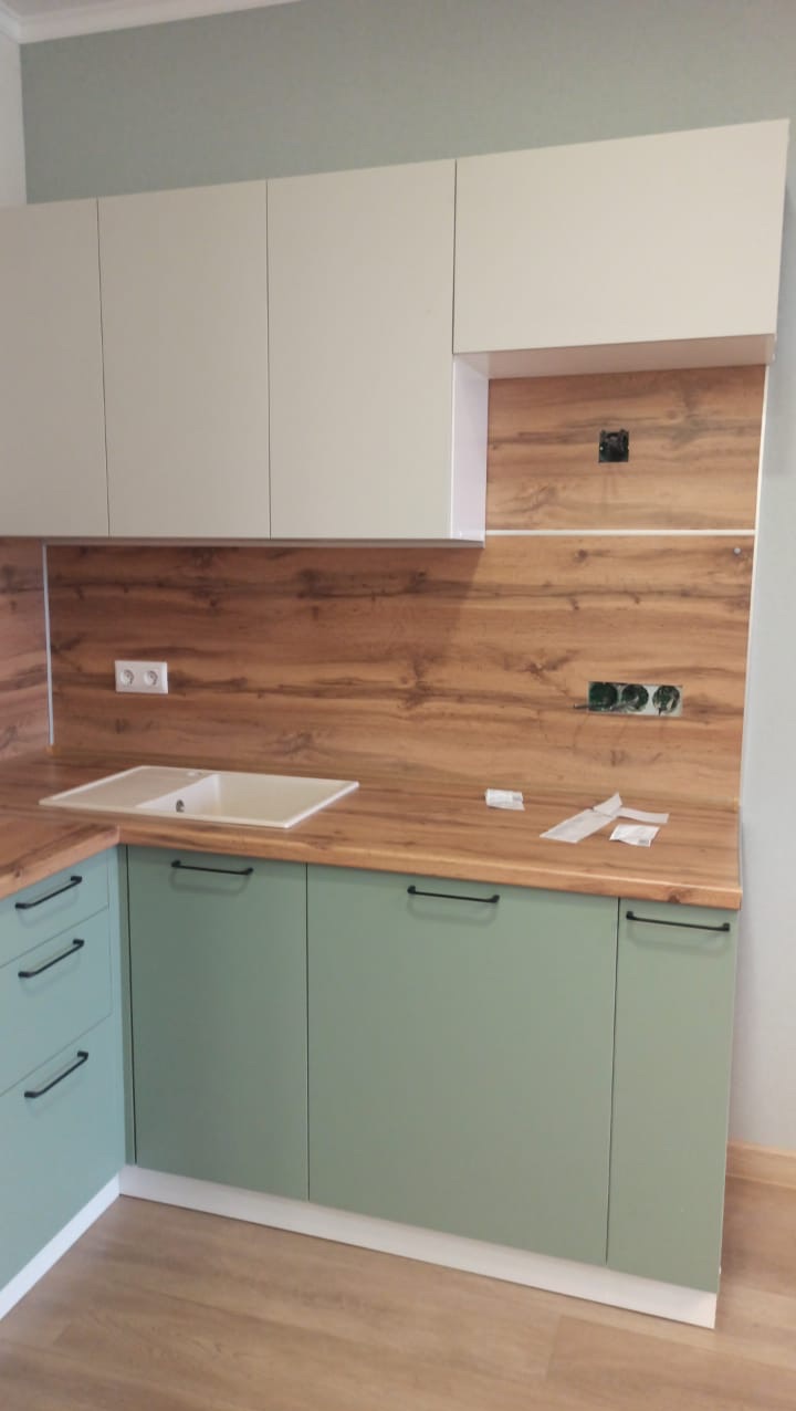 Низ фасады из пластика минт , верх МДФ новая акриловая пленка Лайт грей , которая не боится растворителя !!!