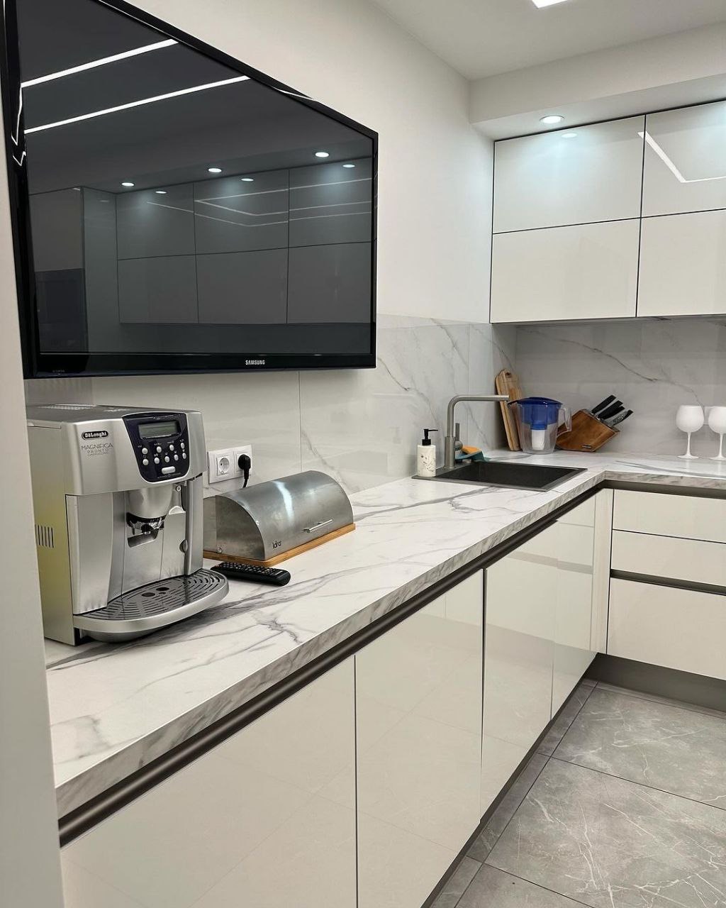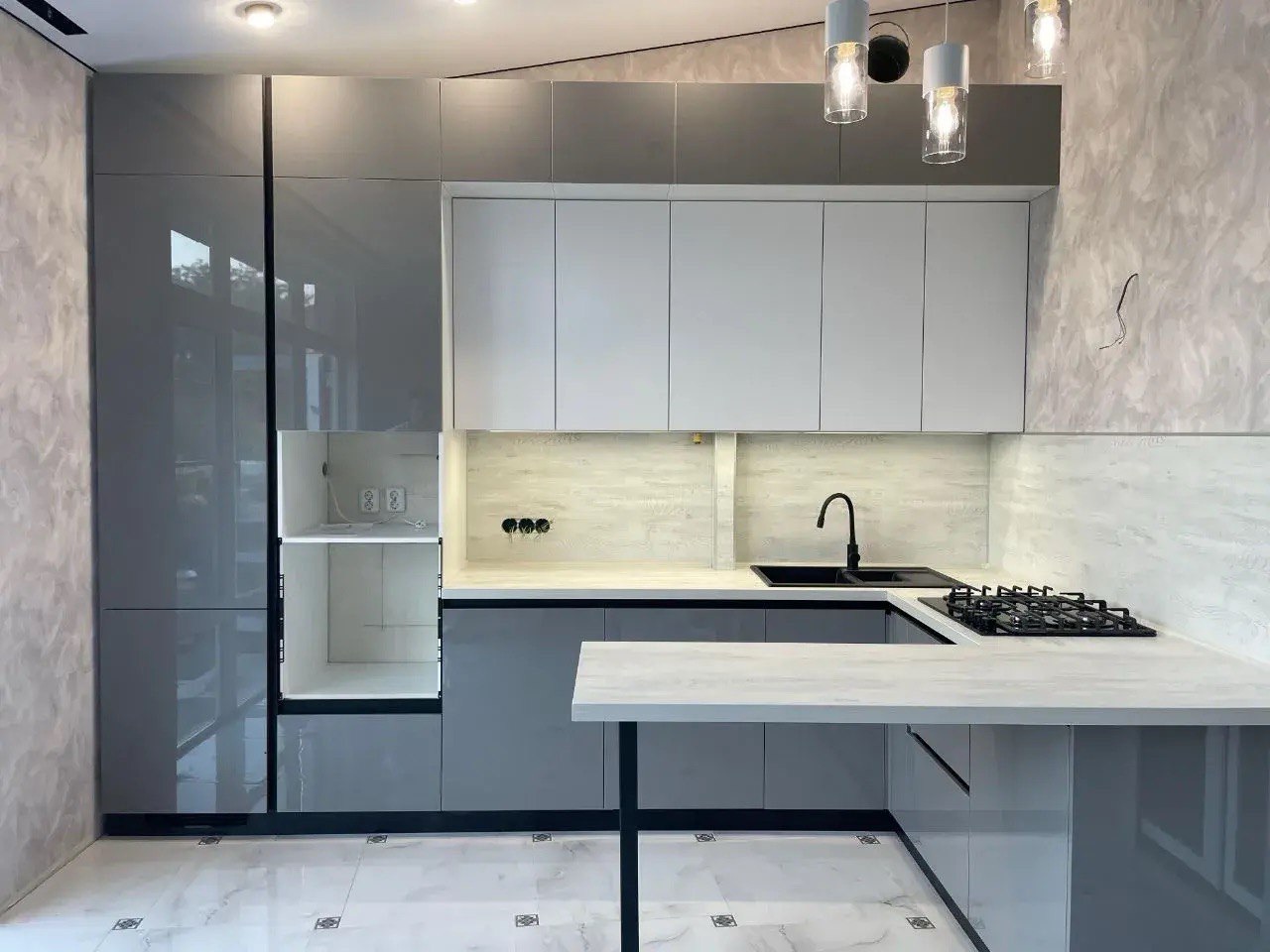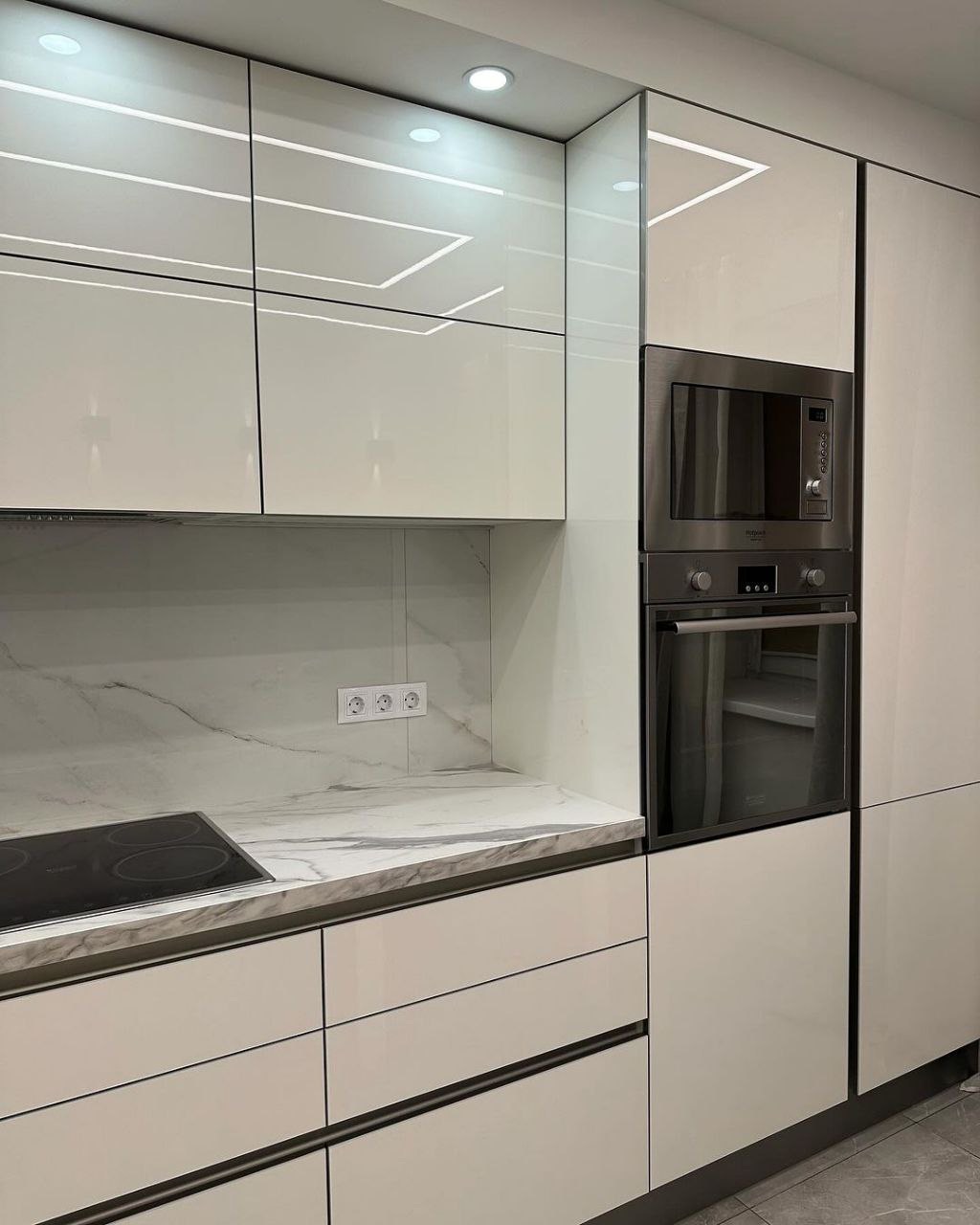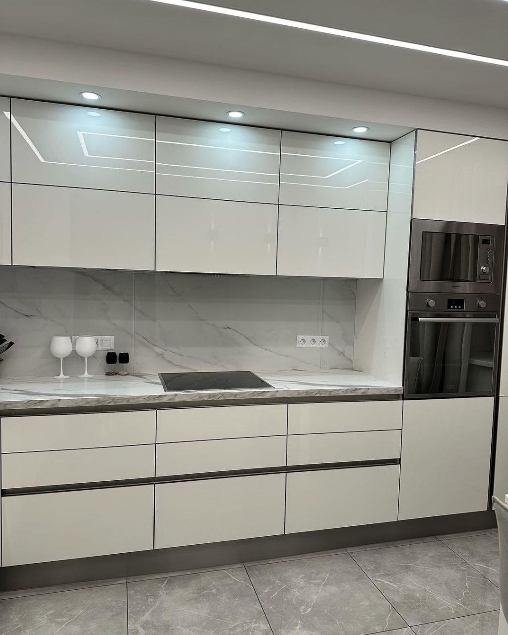 Кухня «Аттика» - это акриловые фасады (пластик)с глянцевым блеском придают кухне лоск и визуально расширяют пространство независимо от того, в каких тонах оформляется интерьер, – светлых или темных. Фасады «ACRYLIT», отделанные термостойким пластиком, выглядят очень элегантно и стильно. Преимущества фасадов «ACRYLIT»: cтойкость к образованию пятен, легкость в уходе, высокая степень глянца, зеркальный эффект, стойкость к образованию трещин, стойкость к выцветанию. В данной кухне есть как глянцевые фасады белого и серого цвета , так и матовые - белый, серый и приятный сливочный цвет )