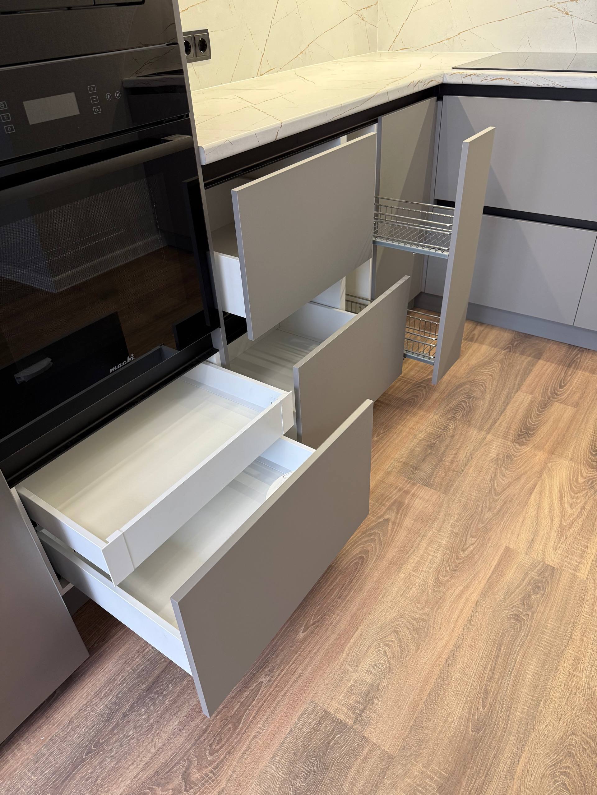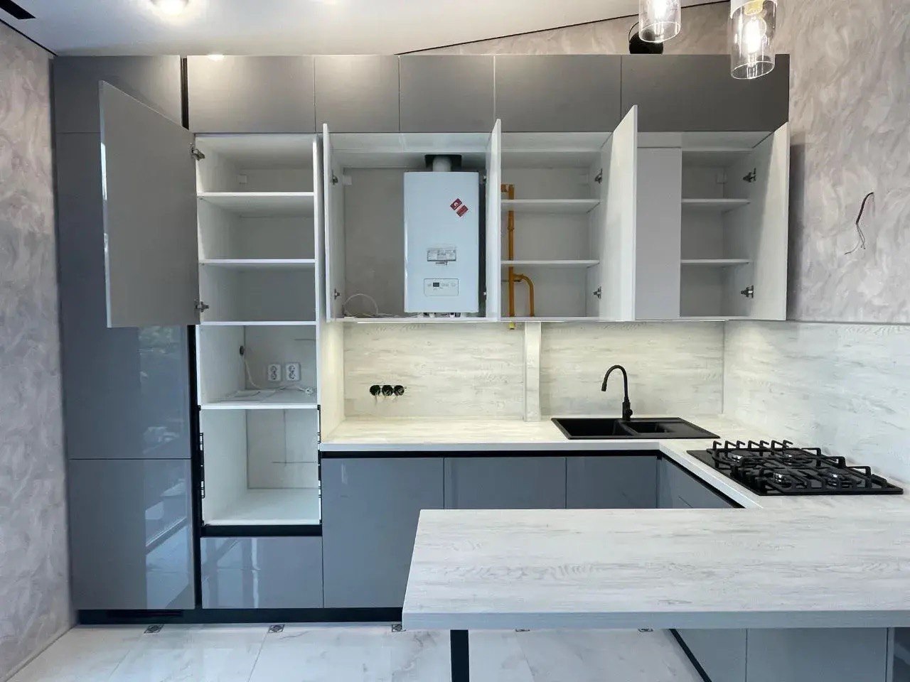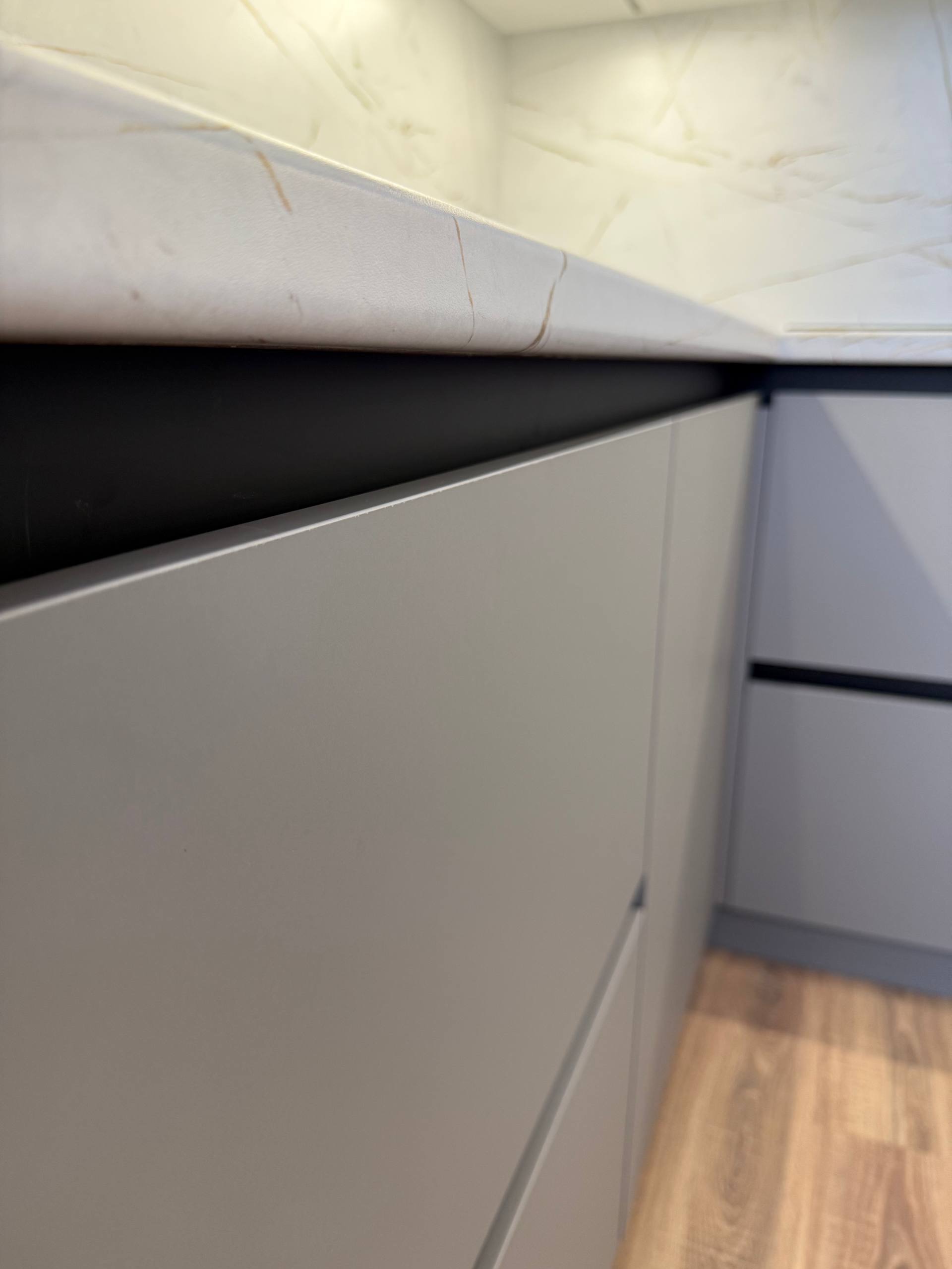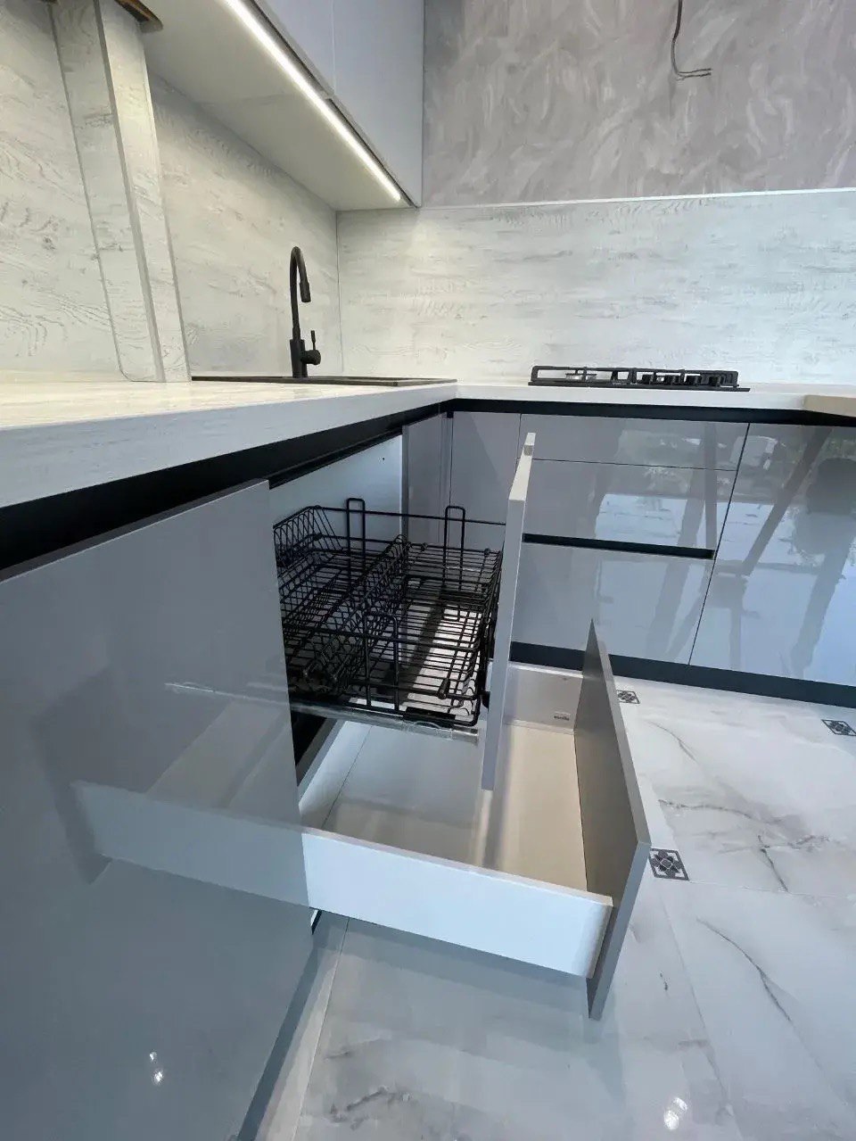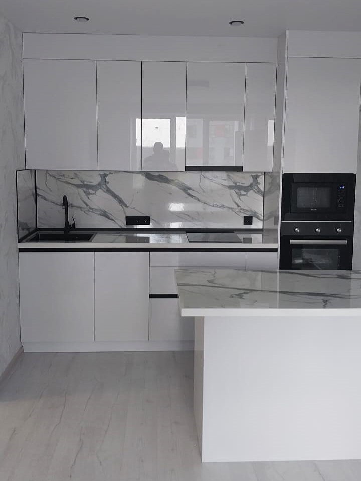 Кухня «Аттика» - это акриловые фасады (пластик)с глянцевым блеском придают кухне лоск и визуально расширяют пространство независимо от того, в каких тонах оформляется интерьер, – светлых или темных. Фасады «ACRYLIT», отделанные термостойким пластиком, выглядят очень элегантно и стильно. Преимущества фасадов «ACRYLIT»: cтойкость к образованию пятен, легкость в уходе, высокая степень глянца, зеркальный эффект, стойкость к образованию трещин, стойкость к выцветанию. В данной кухне есть как глянцевые фасады белого и серого цвета , так и матовые - белый, серый и приятный сливочный цвет )
