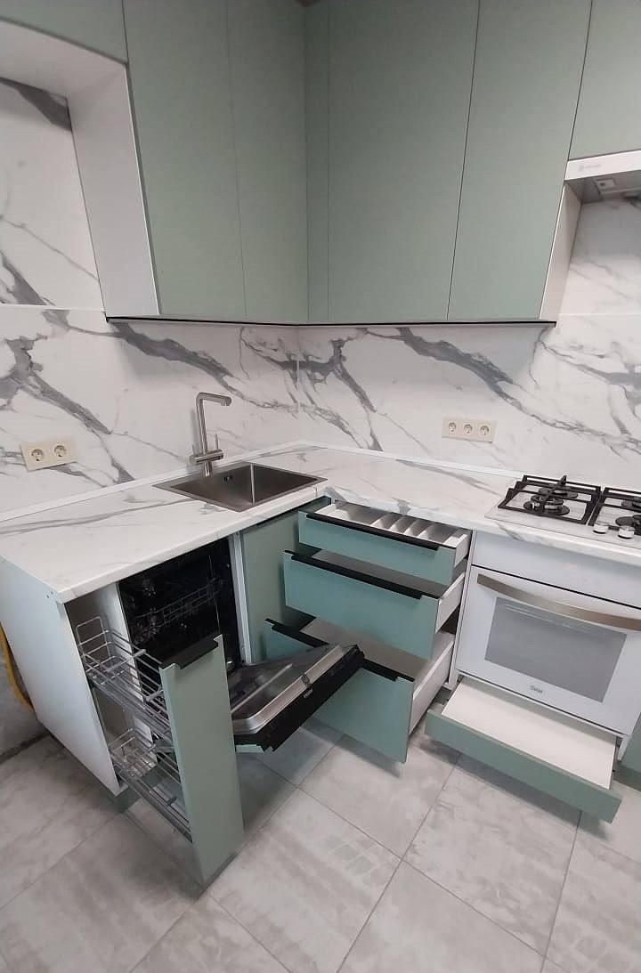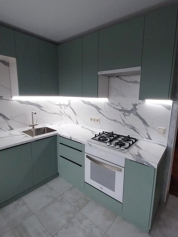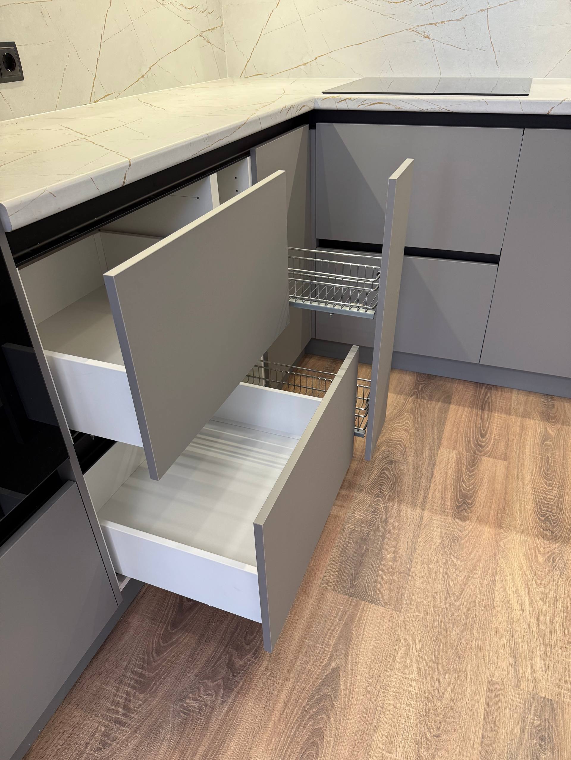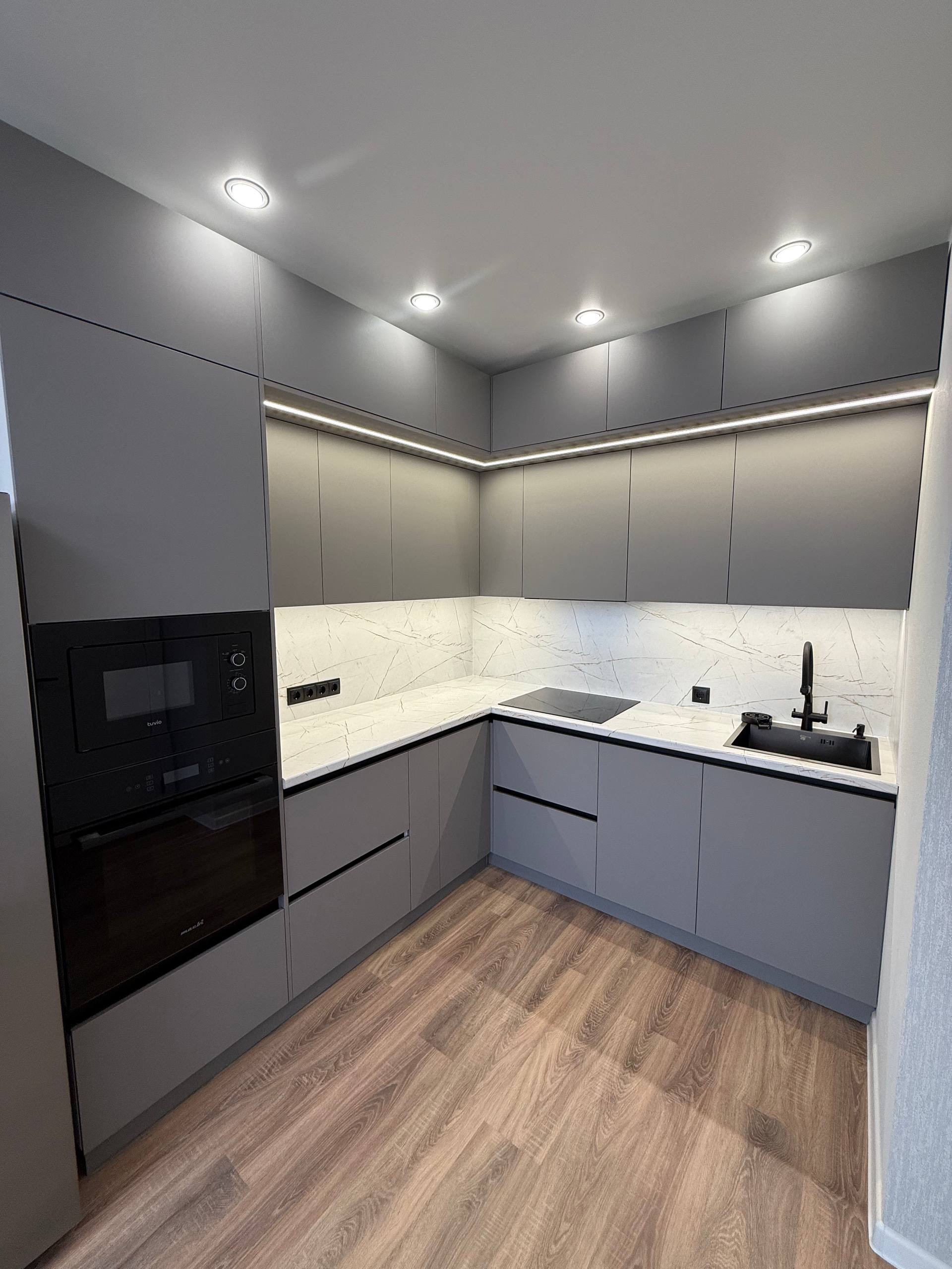 Модульная кухня Аттика с пластиковым матовыми фасадами. Покрытие фасада кухонного гарнитура высококачественный многослойный пластик. Торцы дверей закрыты современной ПВХ кромкой. Верхние шкафы кухонного гарнитура Аттика матовый выпускаются высотой 720мм и 920мм. Современная кухня Аттика позволяет собрать гарнитур любой сложности. Можно сделать кухню прямую, угловую, П-образную. С островом или барной стойкой.