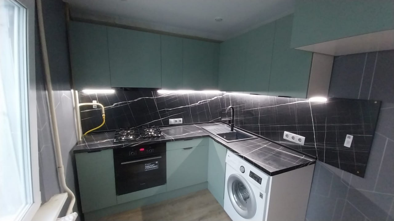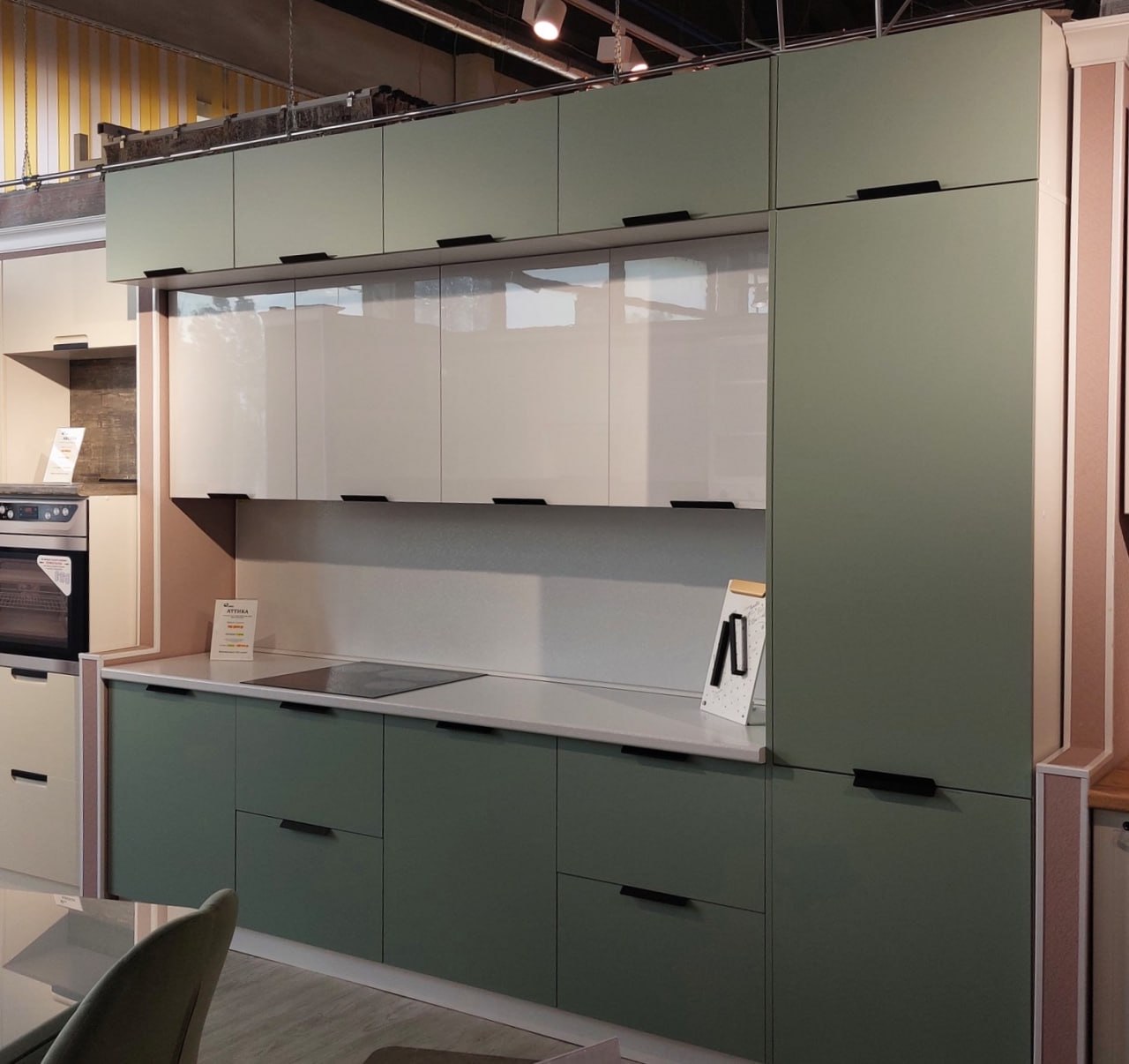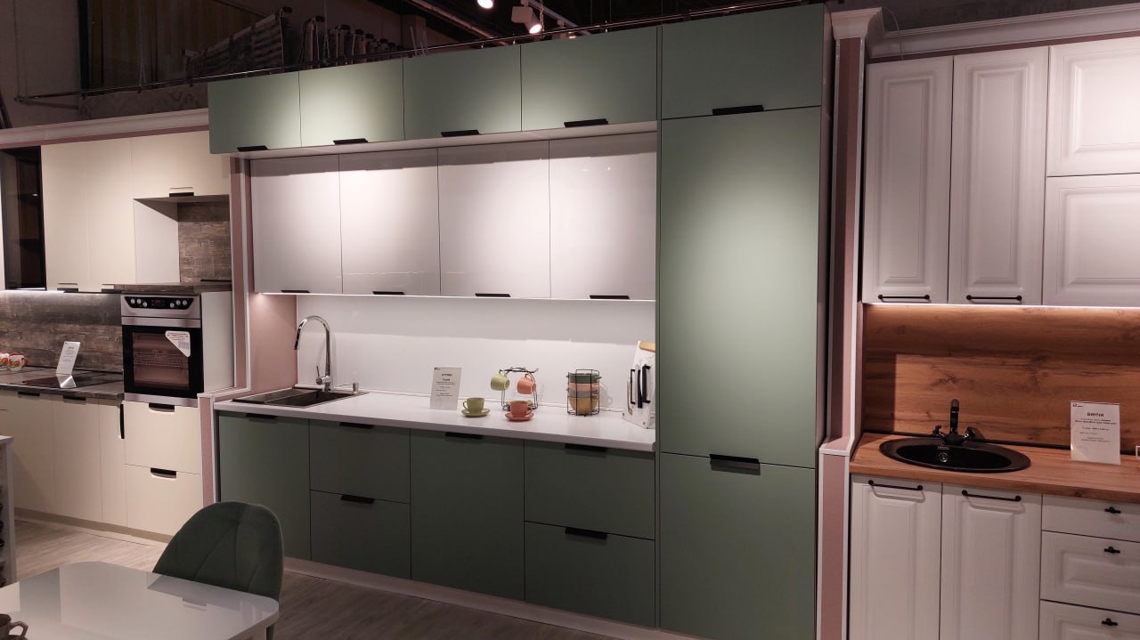 Модульная кухня Аттика с пластиковым матовыми фасадами. Покрытие фасада кухонного гарнитура высококачественный многослойный пластик. Торцы дверей закрыты современной ПВХ кромкой. Верхние шкафы кухонного гарнитура Аттика матовый выпускаются высотой 720мм и 920мм. Современная кухня Аттика позволяет собрать гарнитур любой сложности. Можно сделать кухню прямую, угловую, П-образную. С островом или барной стойкой.